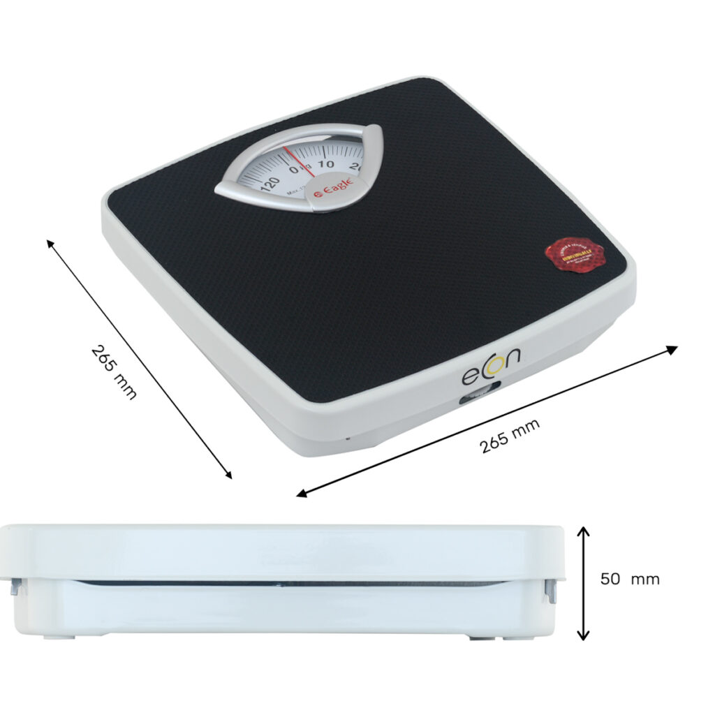 Analogue Weighing scale with dimensions of 265 mm (length) x 265 mm (breath) x 50 mm (height)