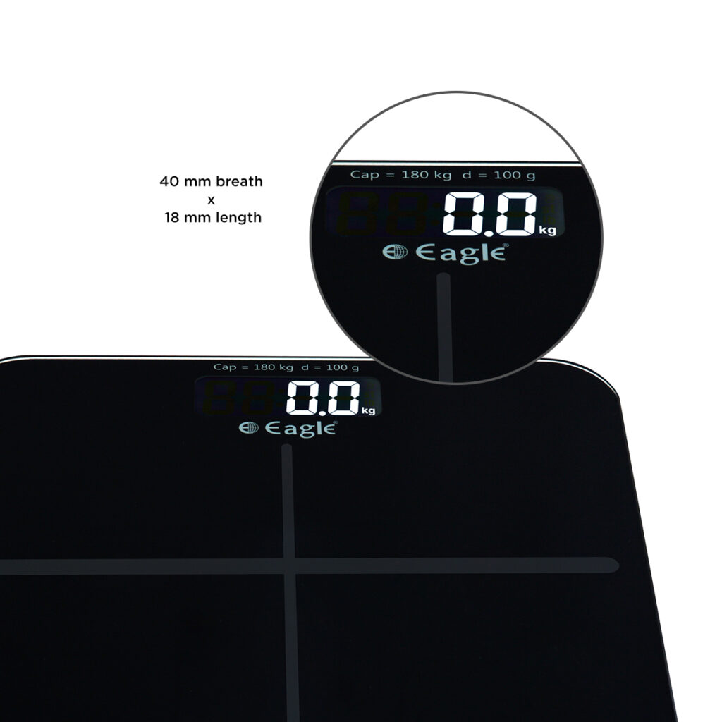 Finally a robust scale for the entire family: The elegant EAGLE bathroom scale can weigh up to 180 kg, featuring the weight on its extra-large display. EEP1100A is not only best suited for heavyweights, but also flyweights, thanks to its precise weighing in 100 g increments. Very comfortable: The extra-large, LCD-lit display makes a great addition to the design and is even easily readable in low-light conditions. With the extra-clear safety glass in soothing colours, EEP1100A is a timeless modern accessory, sleek and thin in shape, and goes perfectly in any bathroom to set a great tone. And in addition, the scale accrues points in safety features: For stability, it offers an extra-large weighing surface made from especially strong safety glass, and its base is equipped with anti-slip feet. It is also unnecessary to stoop down. The display switches on immediately upon stepping on the scale and automatically turns off after weighing. This is energy-saving and prolongs battery life for up to three years when used on average twice a day. Batteries included.